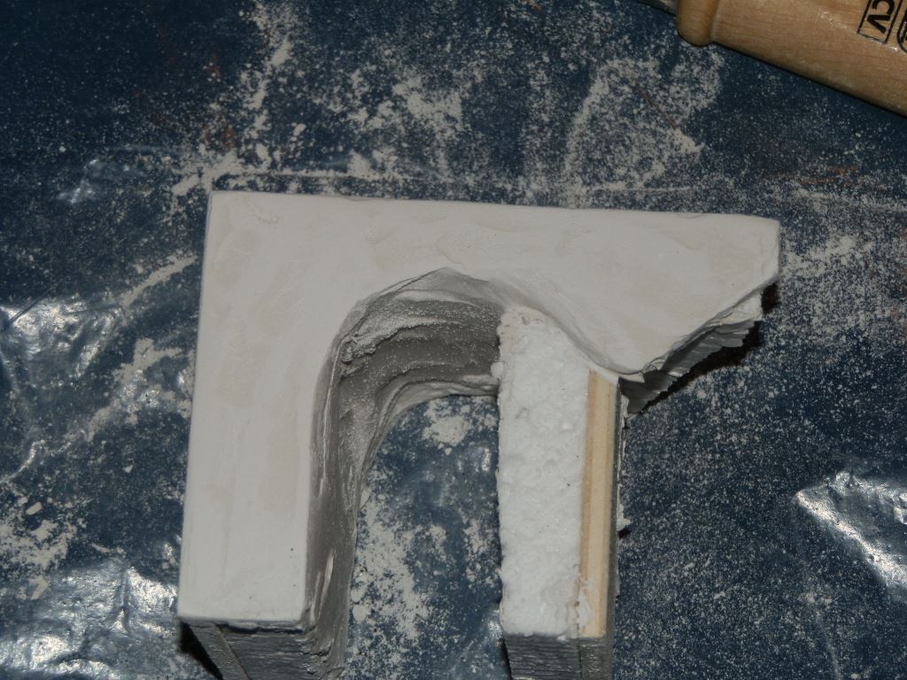 Ich mische für die Masse 1:1 normalen Modell Gips und Motofill Spachtel (Innen). Der Vorteil dieser Mischung ist es, das sie sich fast eine Stunde ohne Probleme verarbeiten lässt und sich nach dem Trocken prima schleifen und ritzen lässt.